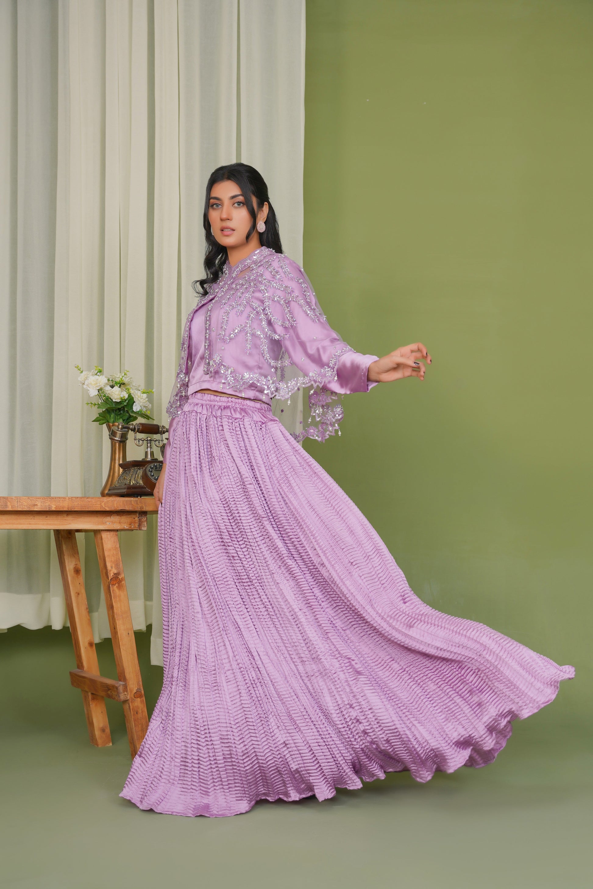 Embelish Lilac in Majestic Long Tail Cape paired with a stunning Lehnga Choli Crush Maxi
