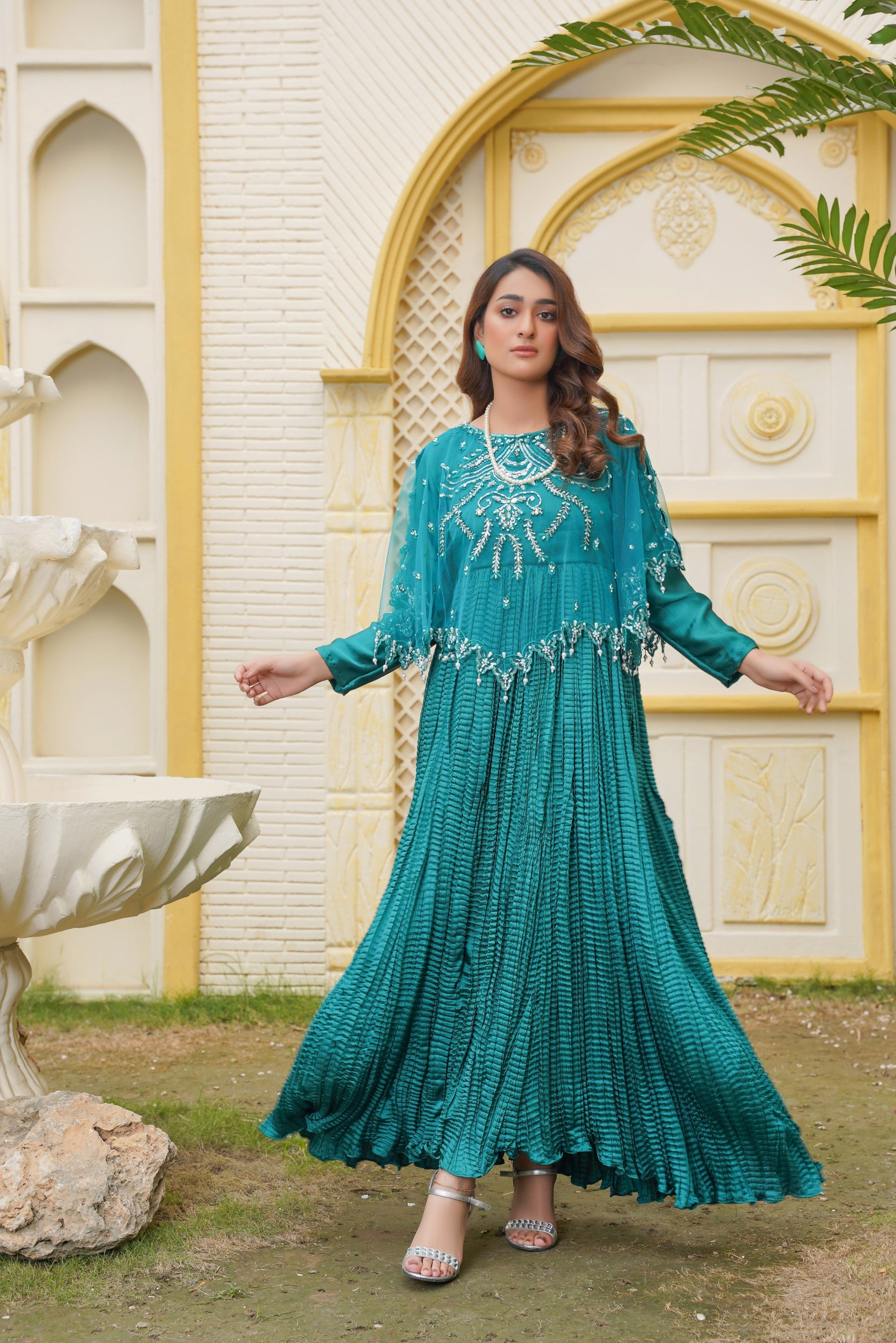 Glamour in Green Viora Majestic Cape & Embellished Crush Flare Maxi
