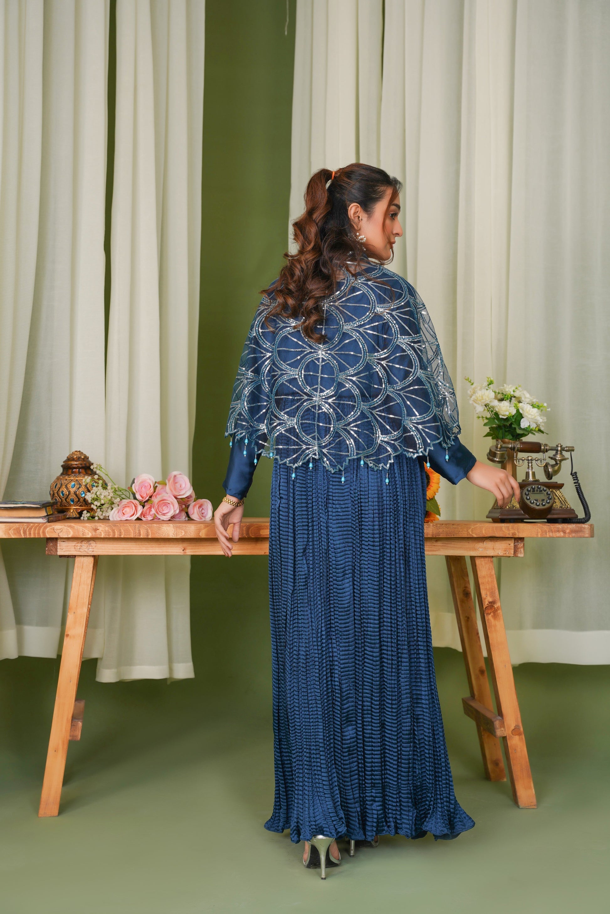 Design: The Sitara Silhouettes Cape, adorned with radiant Sitara embellishments in a unique D-shaped design, brings an element of sparkle to your look, while the Embellished Crush Long Flare Maxi enhances the fluidity of the design with its graceful texture. Perfect for formal occasions, this ensemble captures the essence of starry sophistication and timeless beauty. Let the allure of zinc and the brilliance of Sitara make you shine with understated glamour.